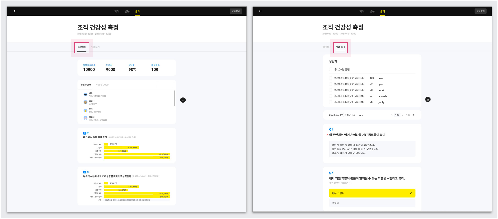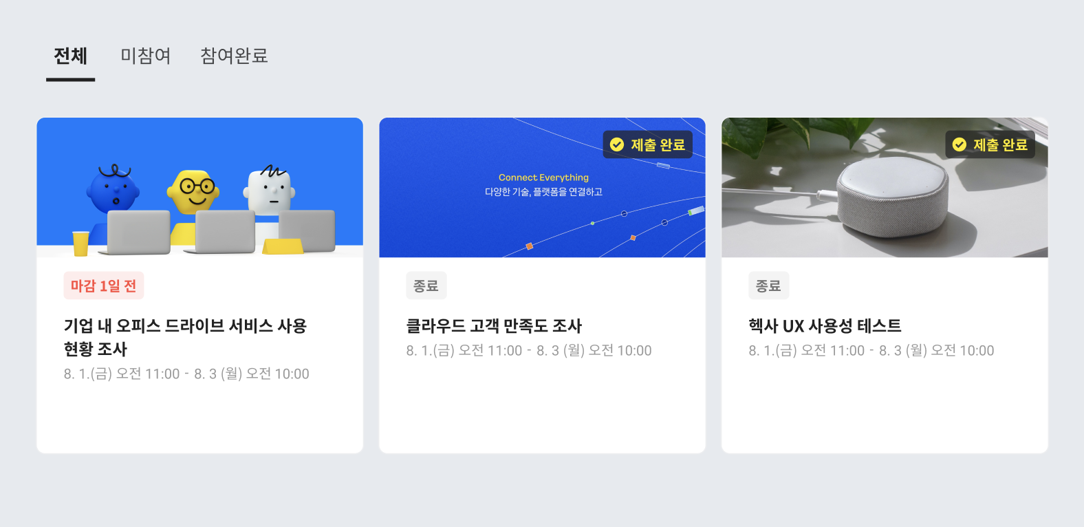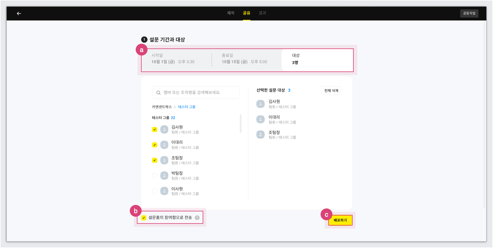| 체크 선택 시 ✅ | 특정 기간 내에 응답할 필요한 경우에 적합 - 설문 참여함으로 해당 설문이 전송됨 - 응답자들은 설문 참여함 또는 설문 링크를 통해 설문에 참여 가능 |