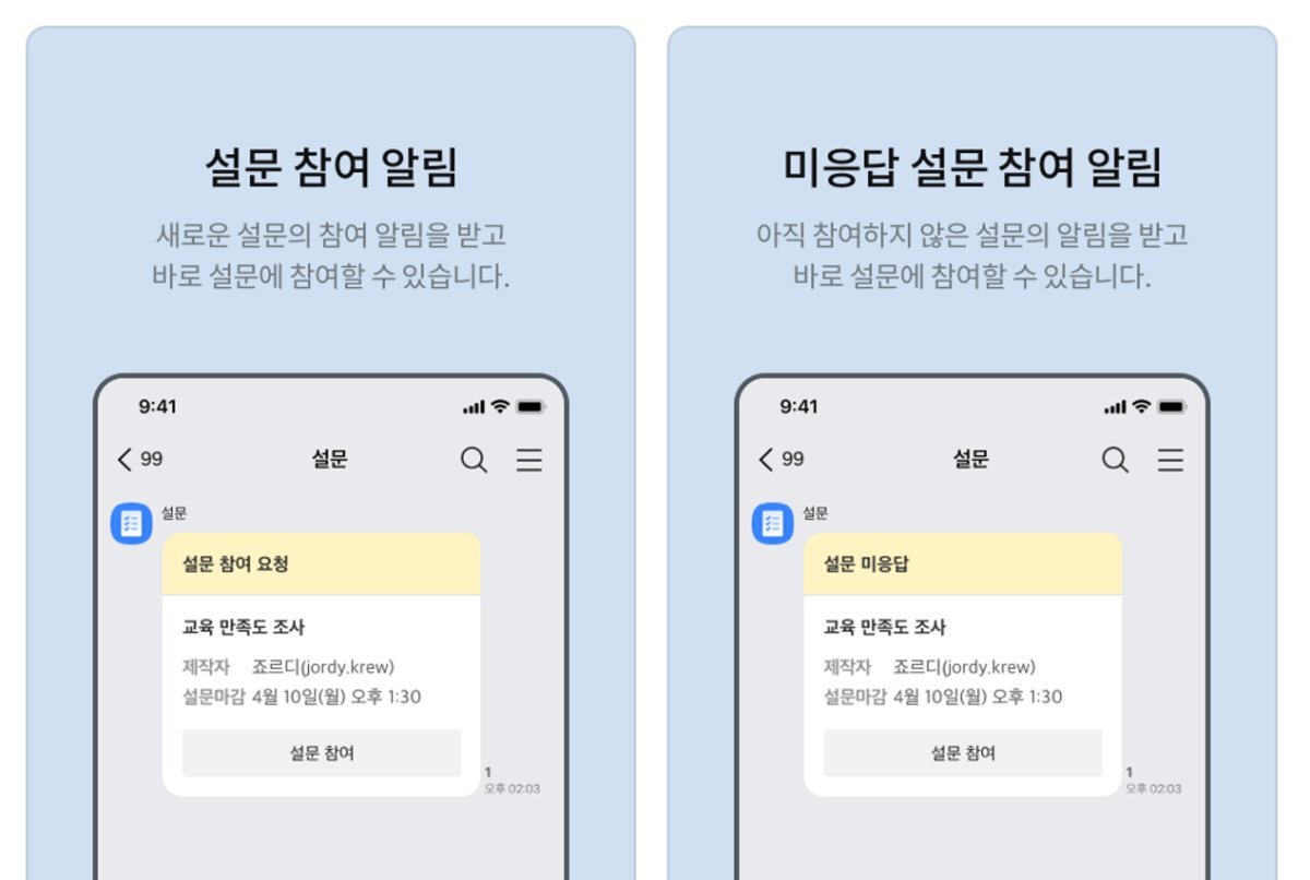 | 체크 선택 해제 시 | 특정 기간 내에 응답할 필요가 없거나 별도의 알림이 필요하지 않은 설문(명함 신청서 등)에 적합 - 설문 참여함으로 해당 설문이 전송되지 않음 - 응답자들은 설문 링크를 통해 설문에 참여 가능 |