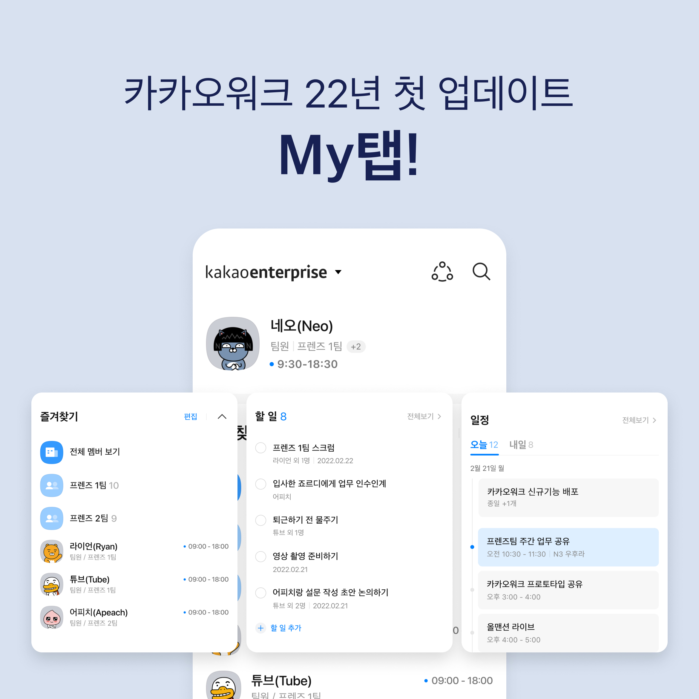 카카오워크팀이 준비한 2022년 첫 번째 업데이트 소식과 함께 우리 같이 오늘도 한 단계 성장해볼까요? 프로일잘러가 되기 위한 한 끗 차이 비법을 알려드릴게요!