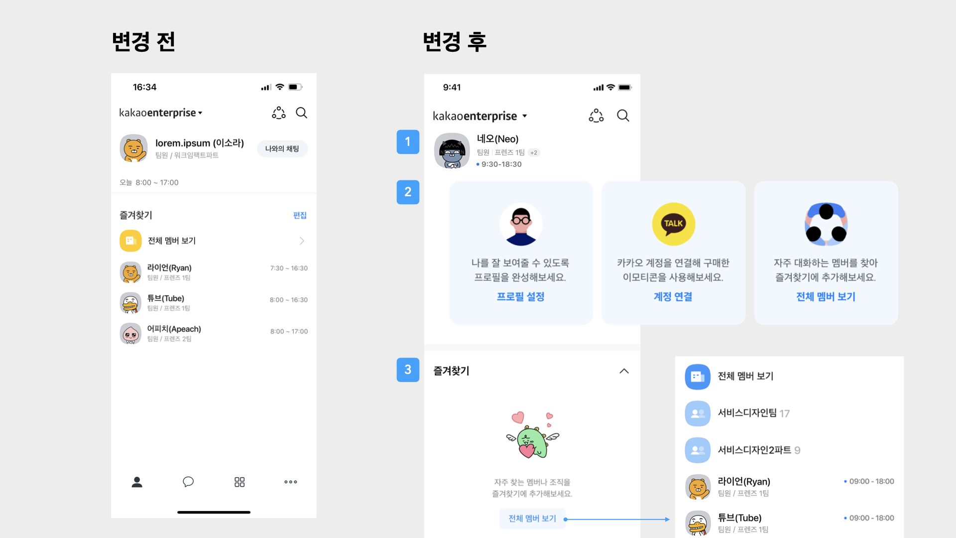 기존 첫 번째 탭에서는 즐겨찾기 멤버들만을 확인하고 관리할 수 있었다면? 새로 업데이트 된 카카오워크 앱에서는 첫번째 탭이 '나'와 관련된 다양한 정보들을 한눈에 확인할 수 있는 My탭으로 새롭게 업데이트되었습니다!