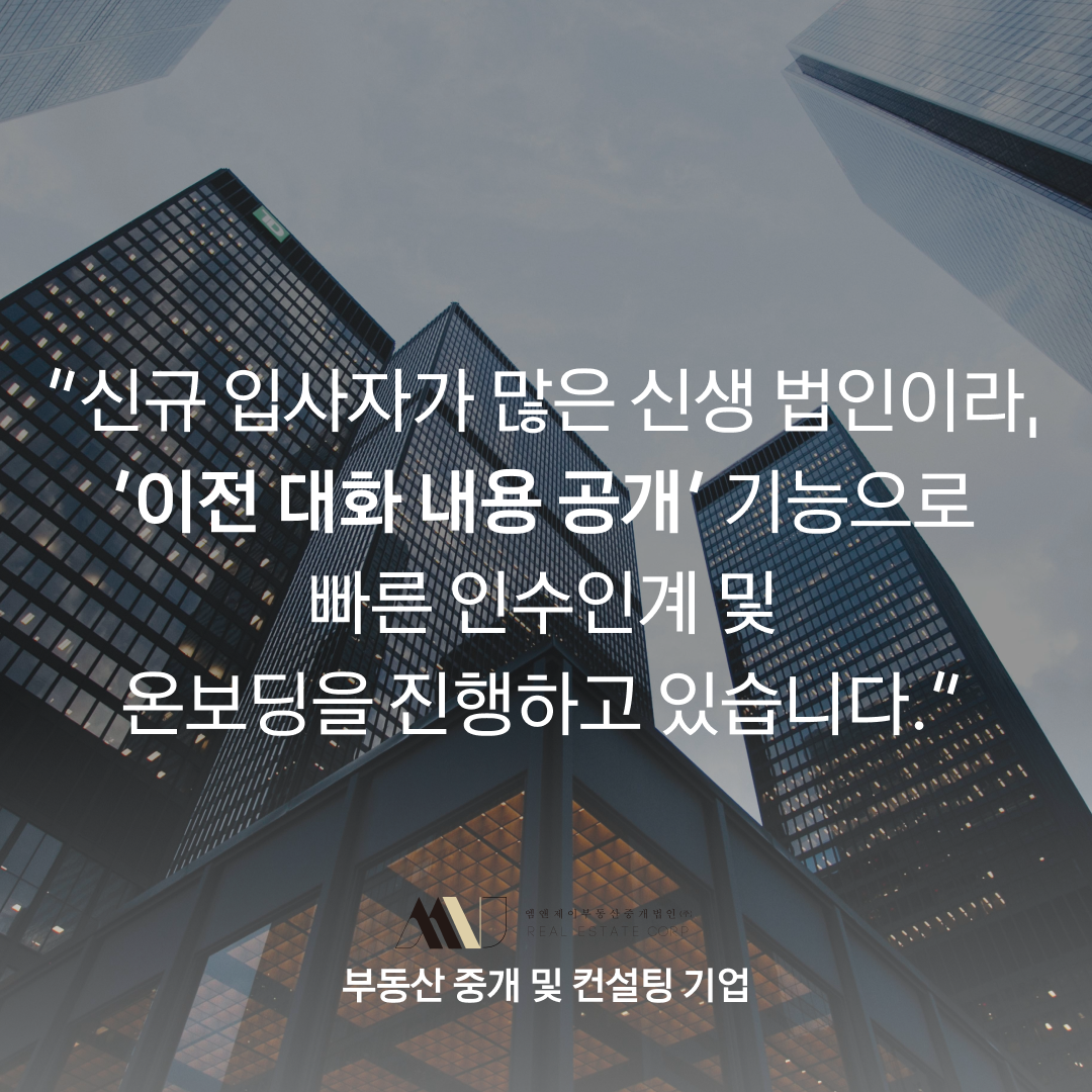 “신규 입사자가 많은 신생 법인이라, ‘이전 대화 내용 보기’ 기능을 활용하여 빠른 인수인계 및 온보딩을 진행하고 있습니다.”