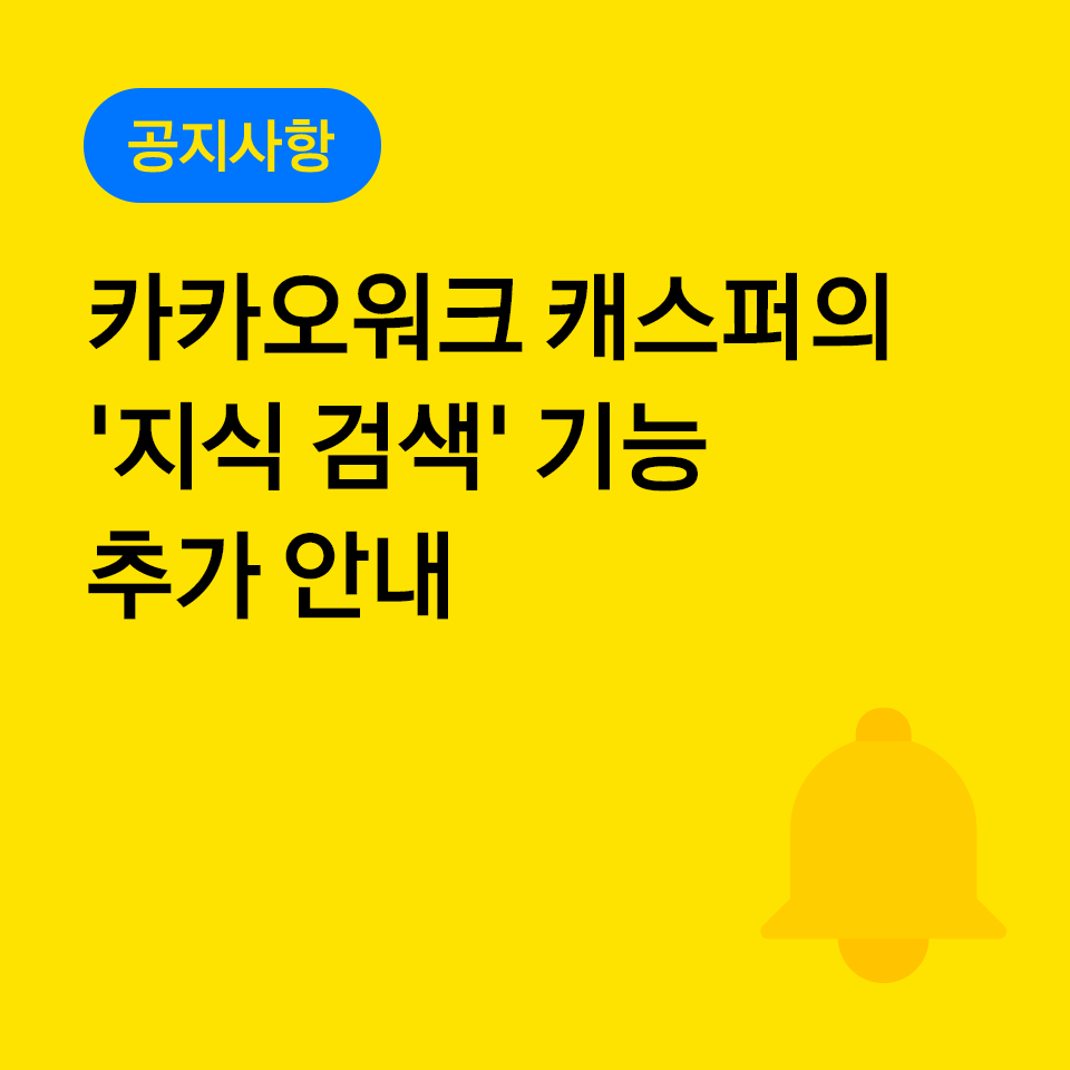 카카오워크 AI 어시스턴트 캐스퍼의 새로운 기능인 "Kakao i Kasper 지식 검색"을 여러분께 새롭게 소개합니다. 이제 캐스퍼의 지식 검색 기능을 통해 우리 회사안에서 더욱 스마트한 업무를 경험해보세요.