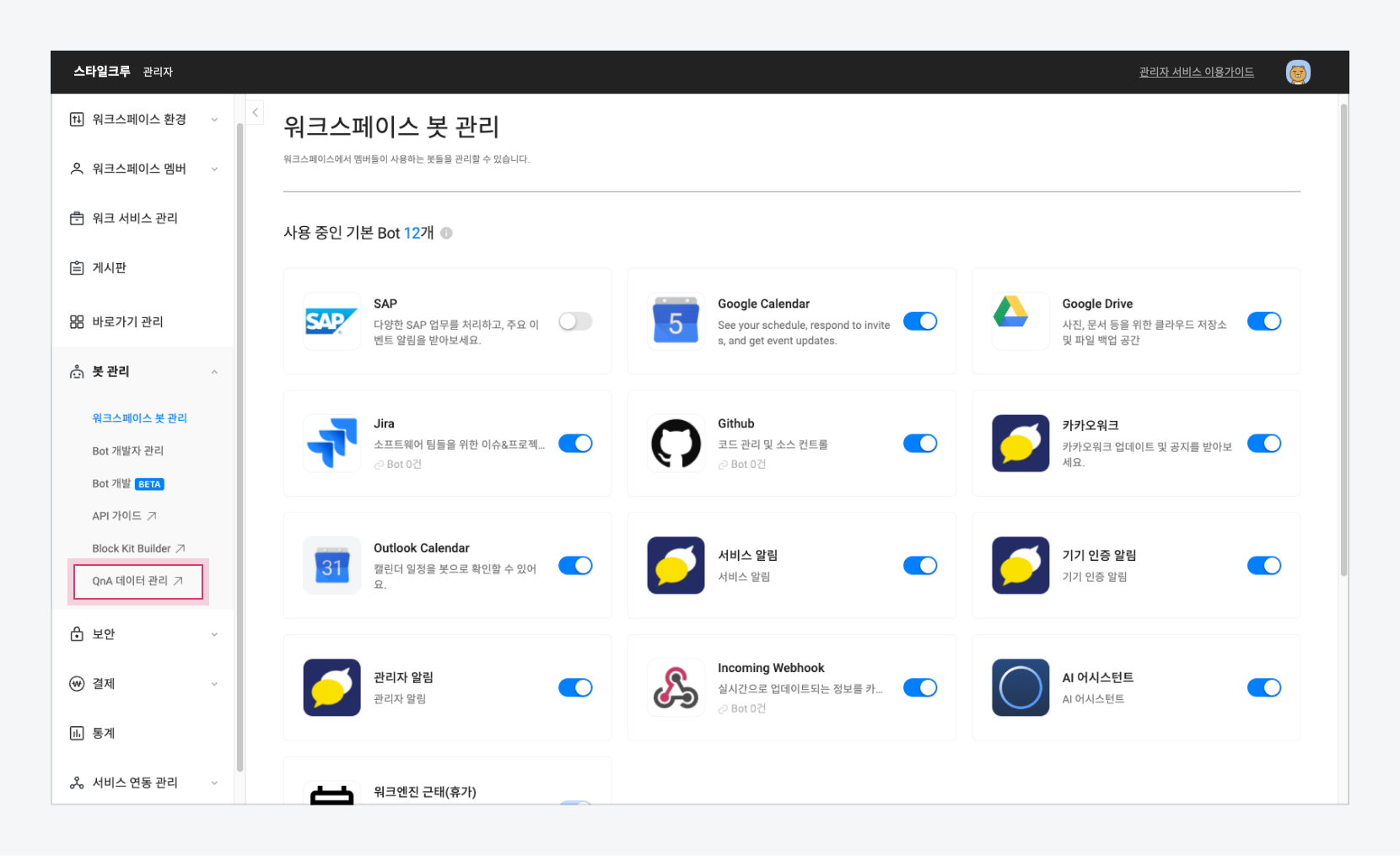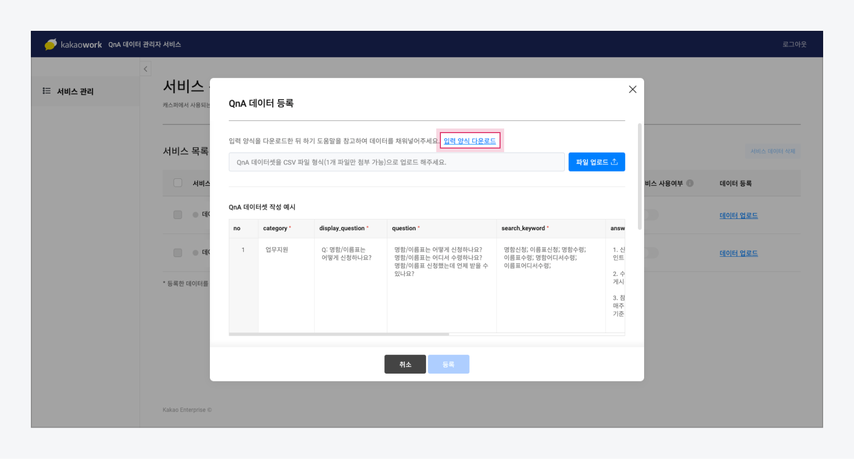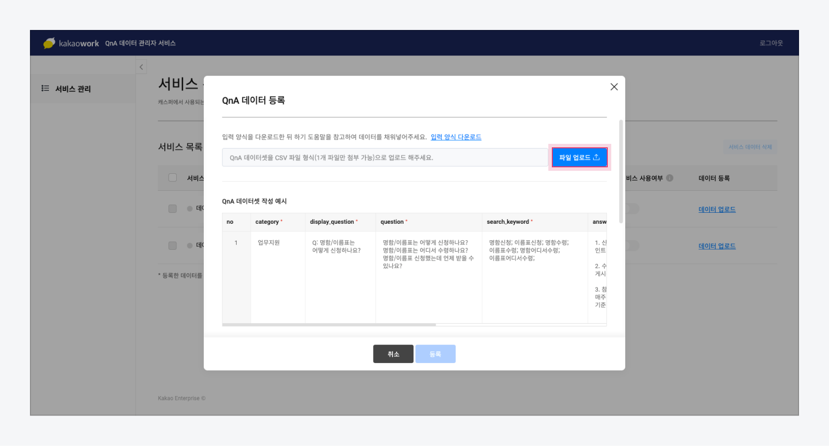1. 카카오워크 관리자사이트 봇 관리 > QnA 데이터 관리 > QnA 데이터 관리자 서비스 에 접속합니다.