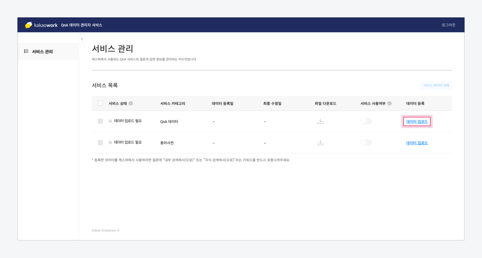 2. 서비스 관리에서 생성하고자 하는 서비스 카테고리의 데이터 업로드를 클릭합니다.