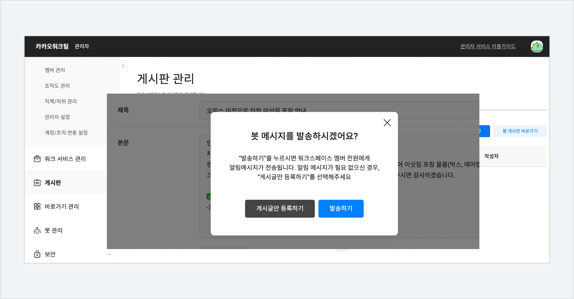 관리자는 모든 구성원에게 공유해야 할 게시글을 작성 후 실시간 알림 메시지를 함께 발송할 수 있고, 구성원들은 해당 봇 메시지를 통해 쉽고 빠르게 게시글을 확인할 수 있습니다.