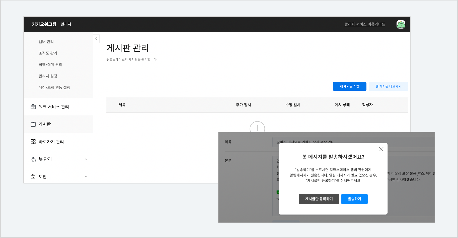관리자는 모든 구성원에게 공유해야 할 게시글을 작성 후 실시간 알림 메시지를 함께 발송할 수 있고, 구성원들은 해당 봇 메시지를 통해 쉽고 빠르게 게시글을 확인할 수 있습니다.