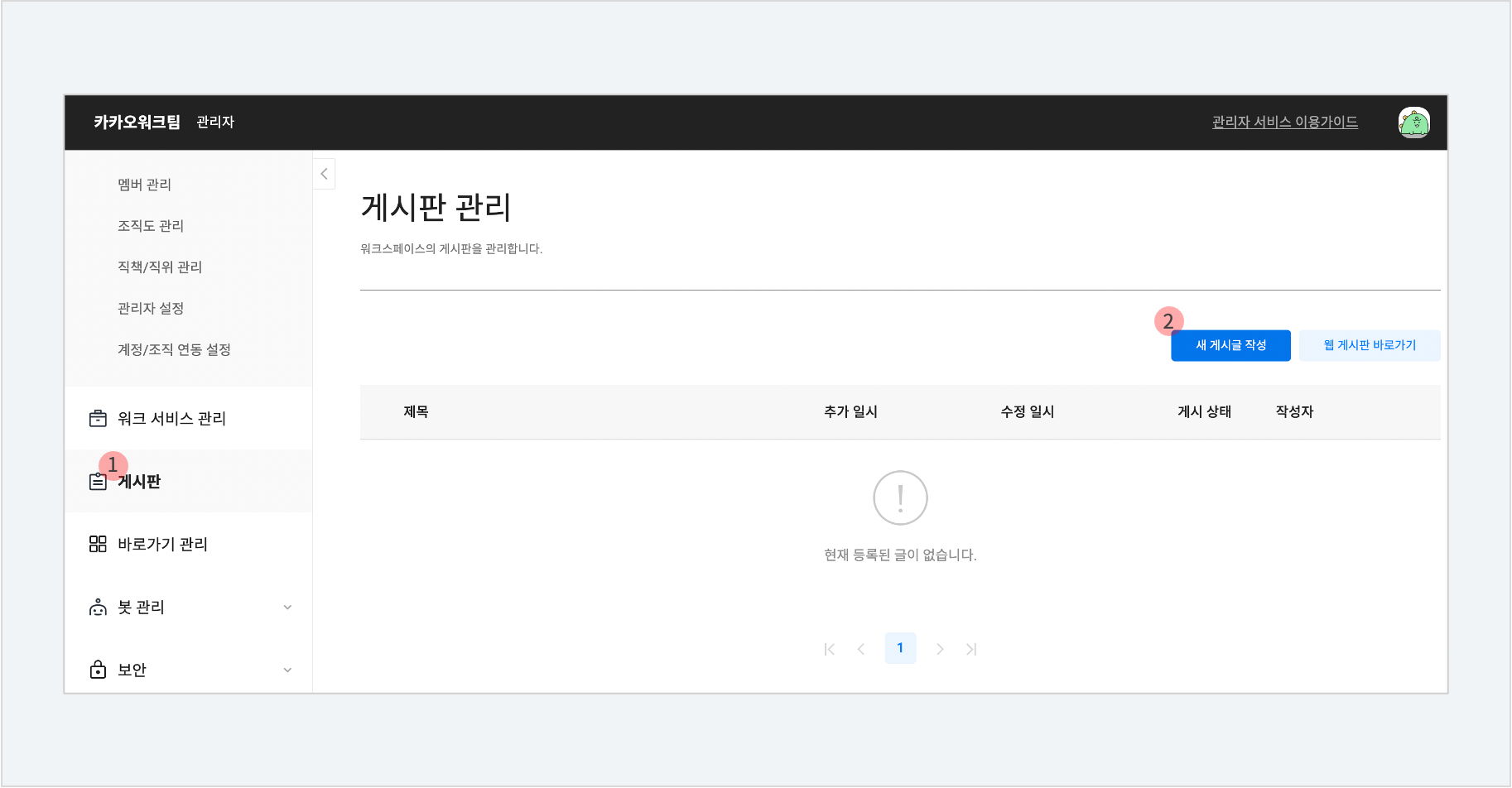1. 관리자 페이지 > [게시판] > [새 게시글 작성] 선택합니다.