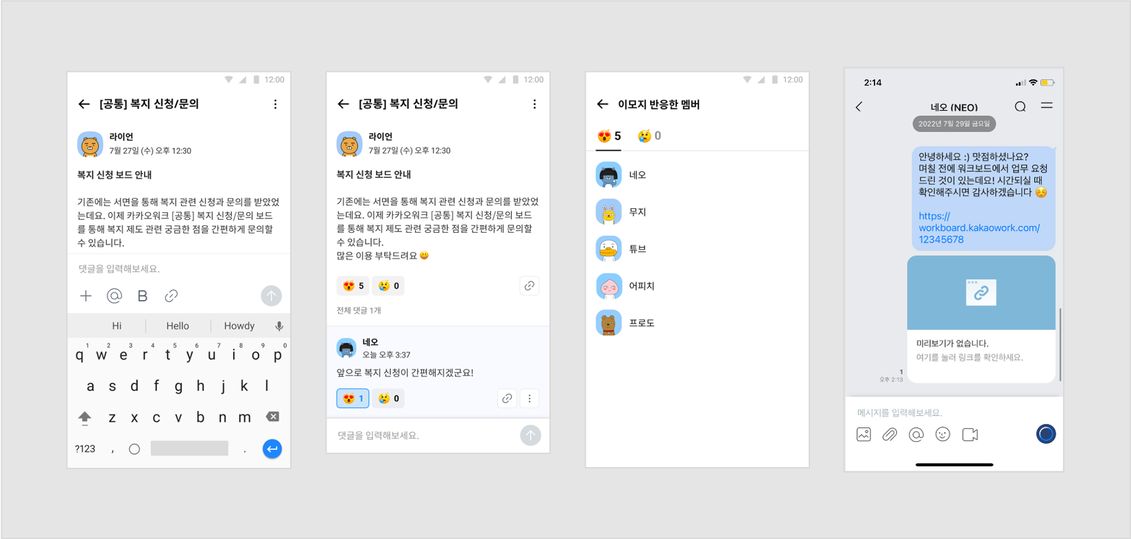 기존 커뮤니케이션 툴이 확인 과정이 복잡하거나 형식적인 구성에 맞춰 커뮤니케이션하기 어려웠다면, 워크보드에서 쉽고 빠르게 업무 얘기를 나누며 이모지로 공감과 리액션을 표현해보세요!