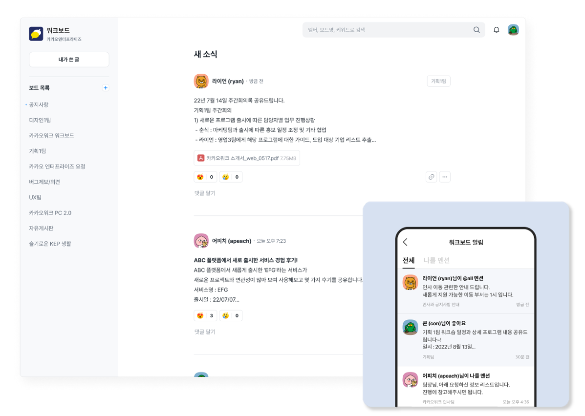 카카오워크의 게시판 형태의 업무 공간인 워크보드 기능을 새롭게 출시하여 소개합니다.