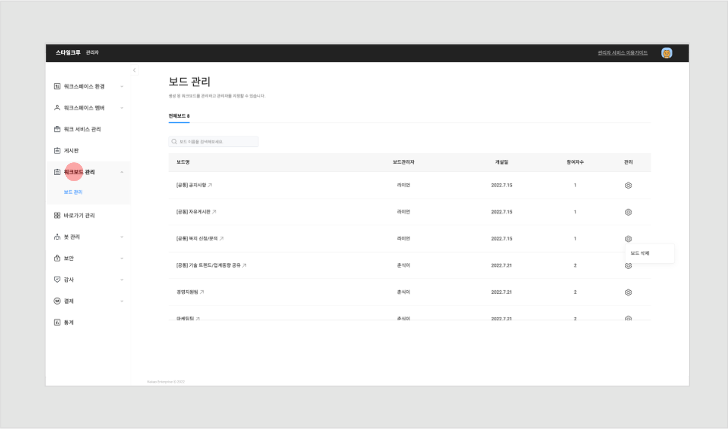 워크보드 관리자 서비스에서는 워크스페이스에서 개설된 모든 보드를 조회하고 관리/삭제할 수 있는 기능을 제공합니다.