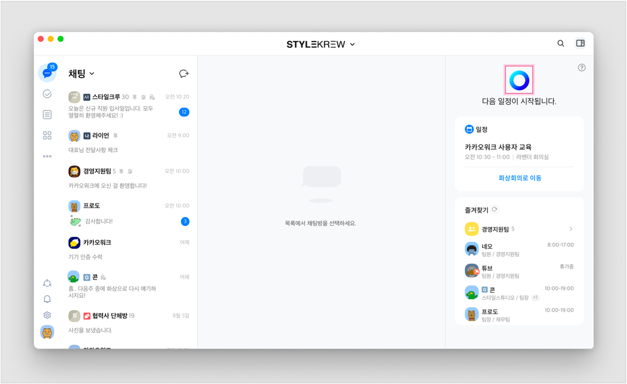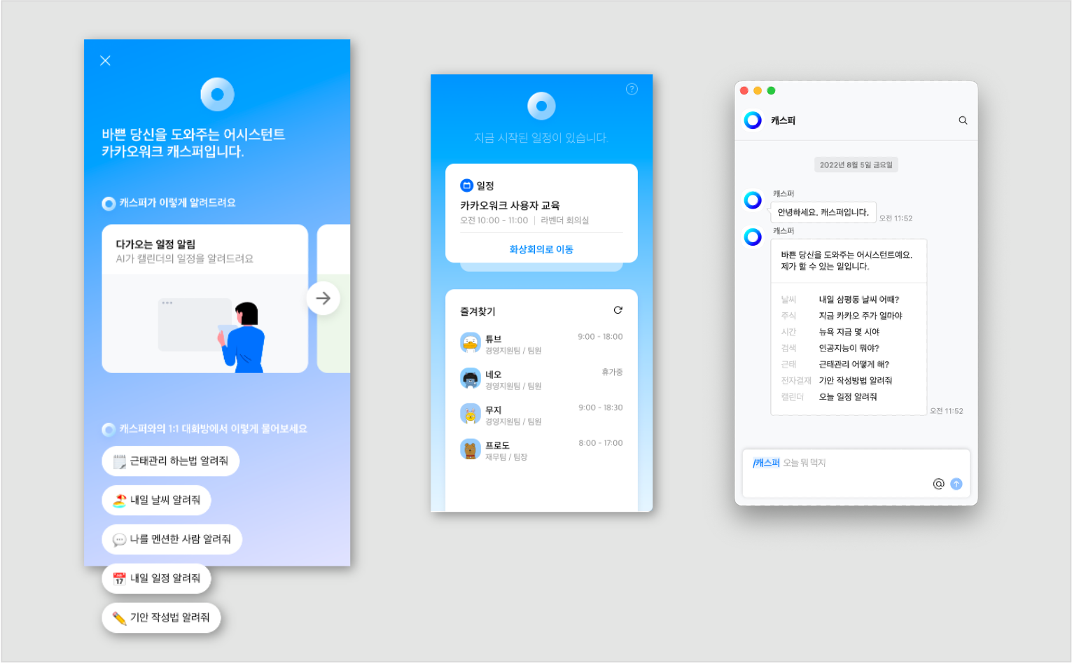 나의 든든한 업무 어시스턴트 캐스퍼의 도움을 쉽게 확인할 수 있으며, 내가 자주 협업하는 사람들을 등록하여 업무 대화를 빠르게 시작할 수 있습니다.