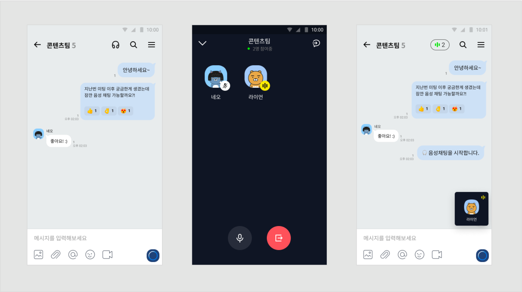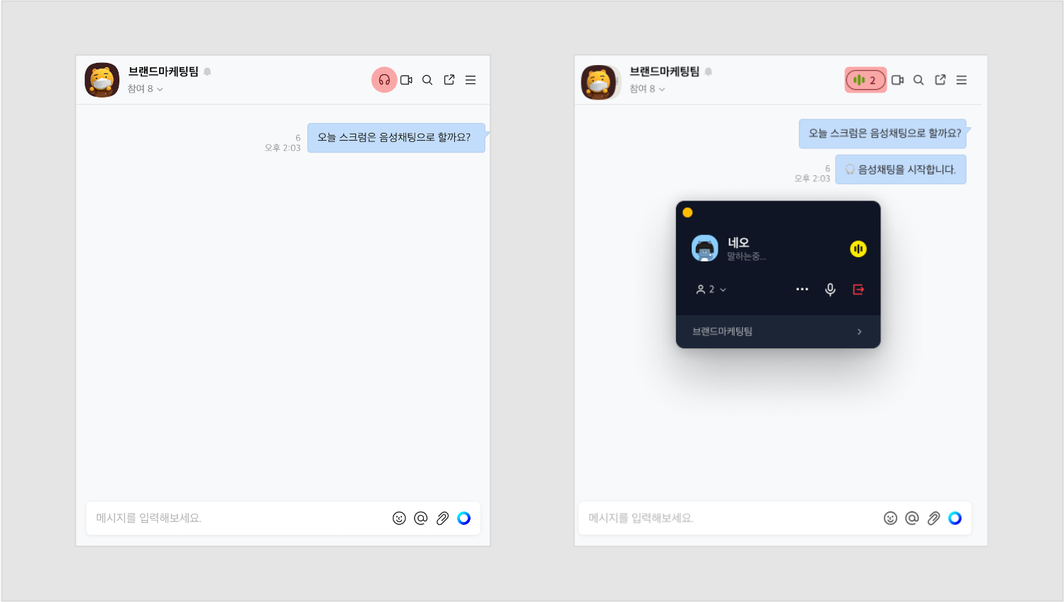 회사 전 구성원이 참여한 채팅방에서도 음성채팅 버튼을 누르면 모두가 참여할 수 있는 음성채팅방이 바로 생성되는데요.