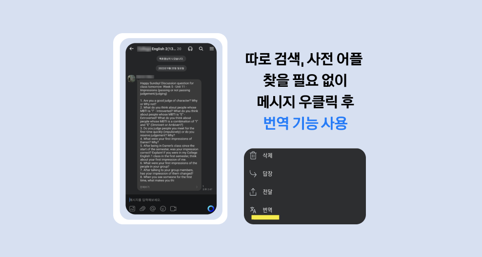 영어 혹은 외국어 기능을 번역해야 할 때, 카카오워크에서 바로 번역할 수 있어 다른 앱이나 사이트를 따로 이용해야 하는 번거로움이 사라졌다는 의견도 있었습니다. 어려운 내용이 있을 때 검색해보거나 사전 어플을 찾을 필요 없이 카카오워크에서 메시지 내용을 꾹 누르면 번역 탭이 나타납니다.