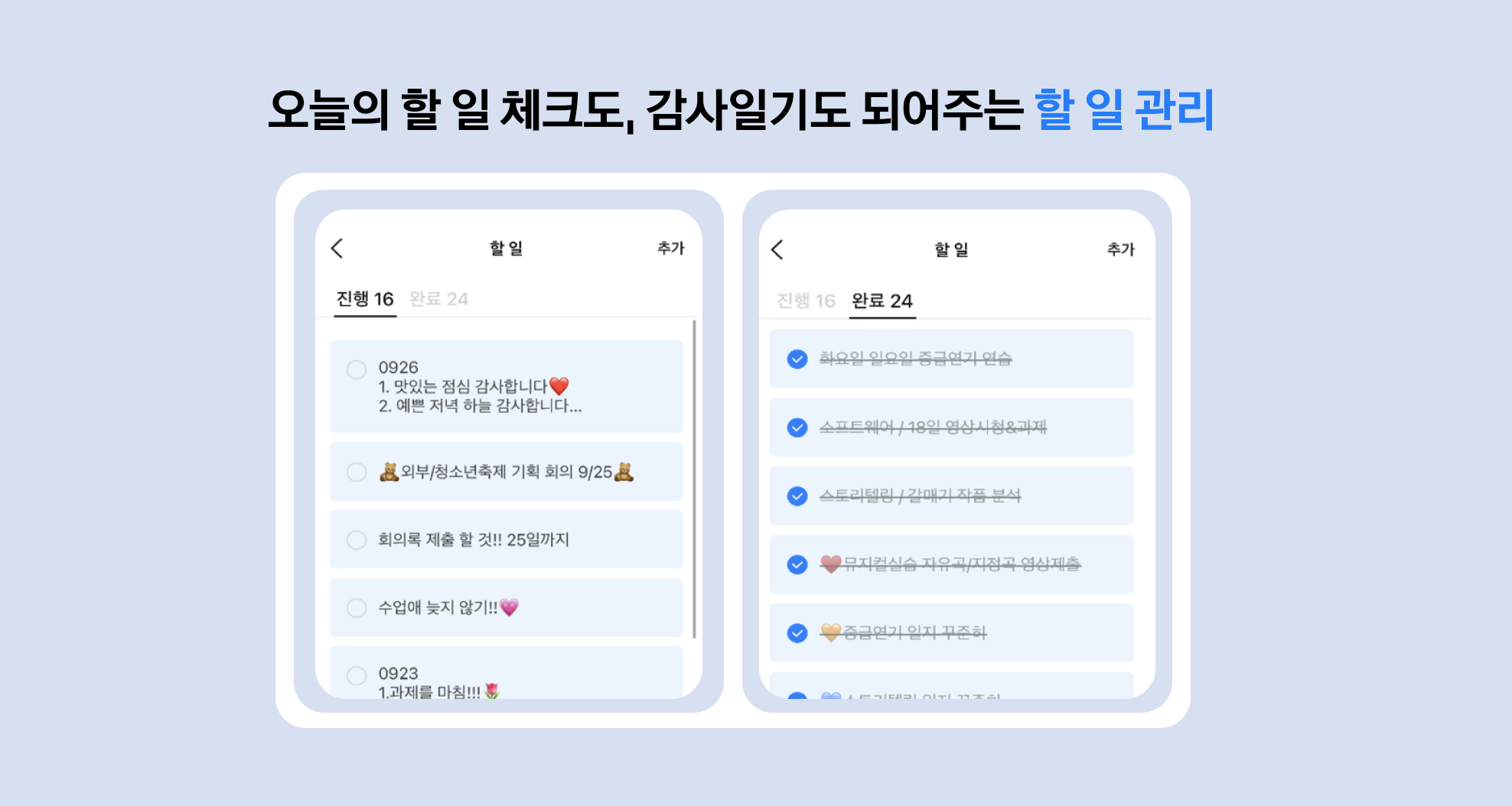 매일 할 일을 작성할 수 있어 별도의 일정 관리 어플 없이도 편리하게 계획표를 짤 수 있어할 일 체크는 물론 오늘 하루 감사일기로도 활용하고 있는 학생분들의 모습을 발견할 수 있었습니다.