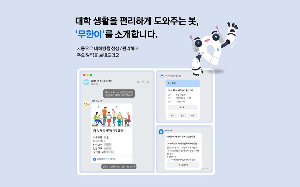* 본 블로그 포스팅에 사용된 이미지들은 실제 학생분들이 보내주신 이미지로, 개인정보를 블러처리 하였습니다. 카카오워크 사용 후기 이미지들을 보내주신 가천대학교 학생분들 모두 감사합니다.