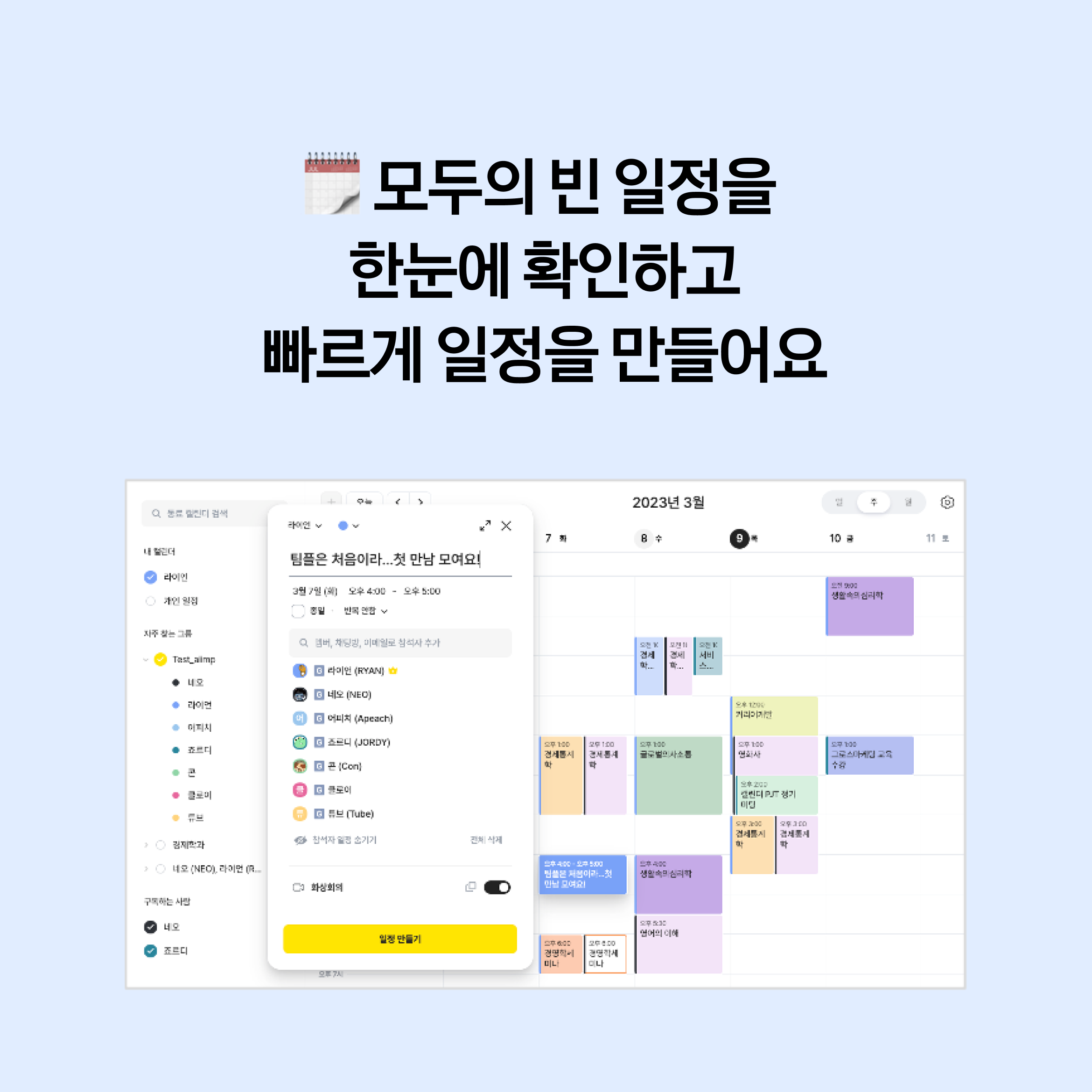 업무뿐만 아니라 수업 시간표나 일정을 등록하고, 이를 활용해서 팀플이나 모임 일정을 잡을 때에도 매우 유용하게 쓸 수 있어요.