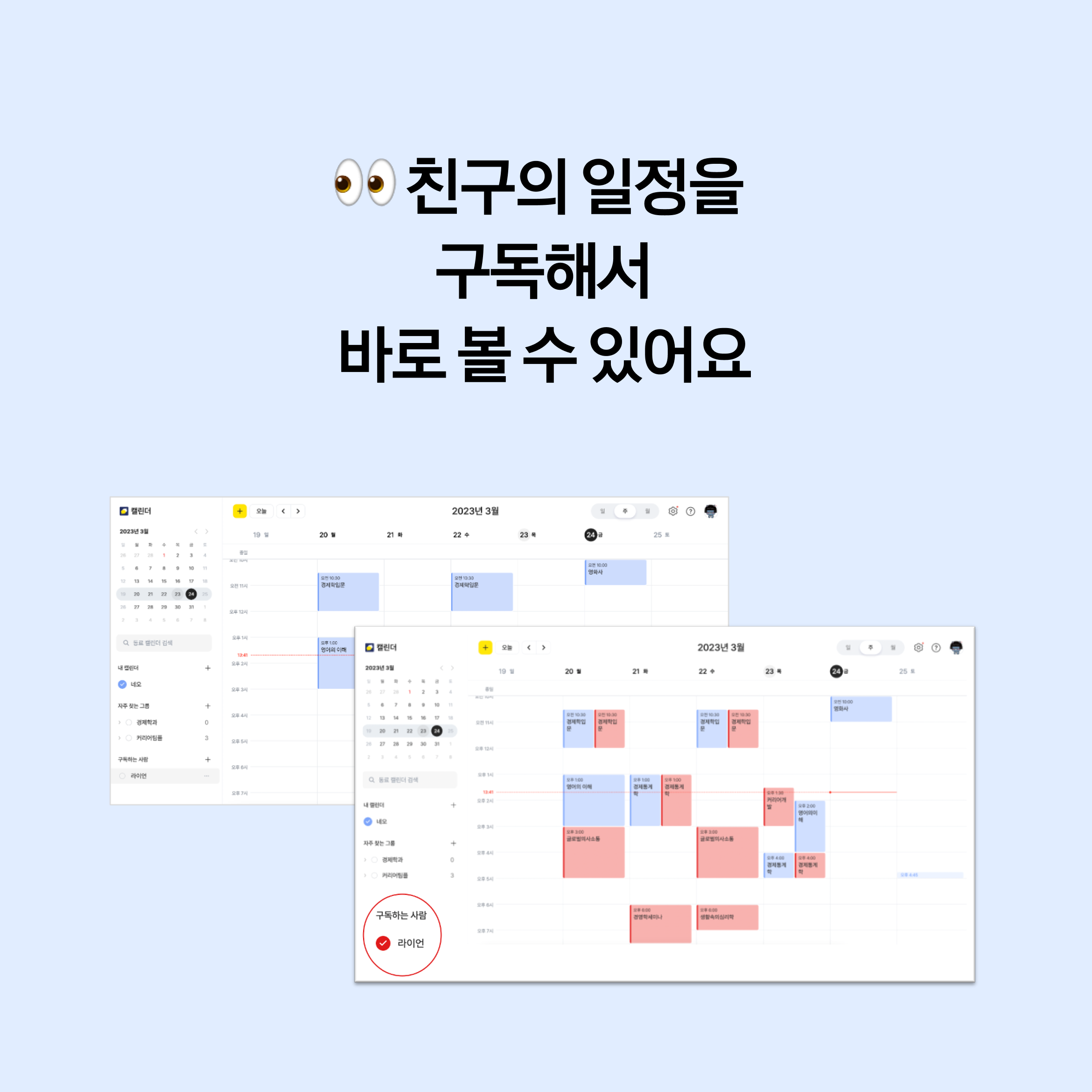 '구독하는 사람'에 친구를 추가하면 친구의 일정도 한눈에🔍 볼 수 있답니다.