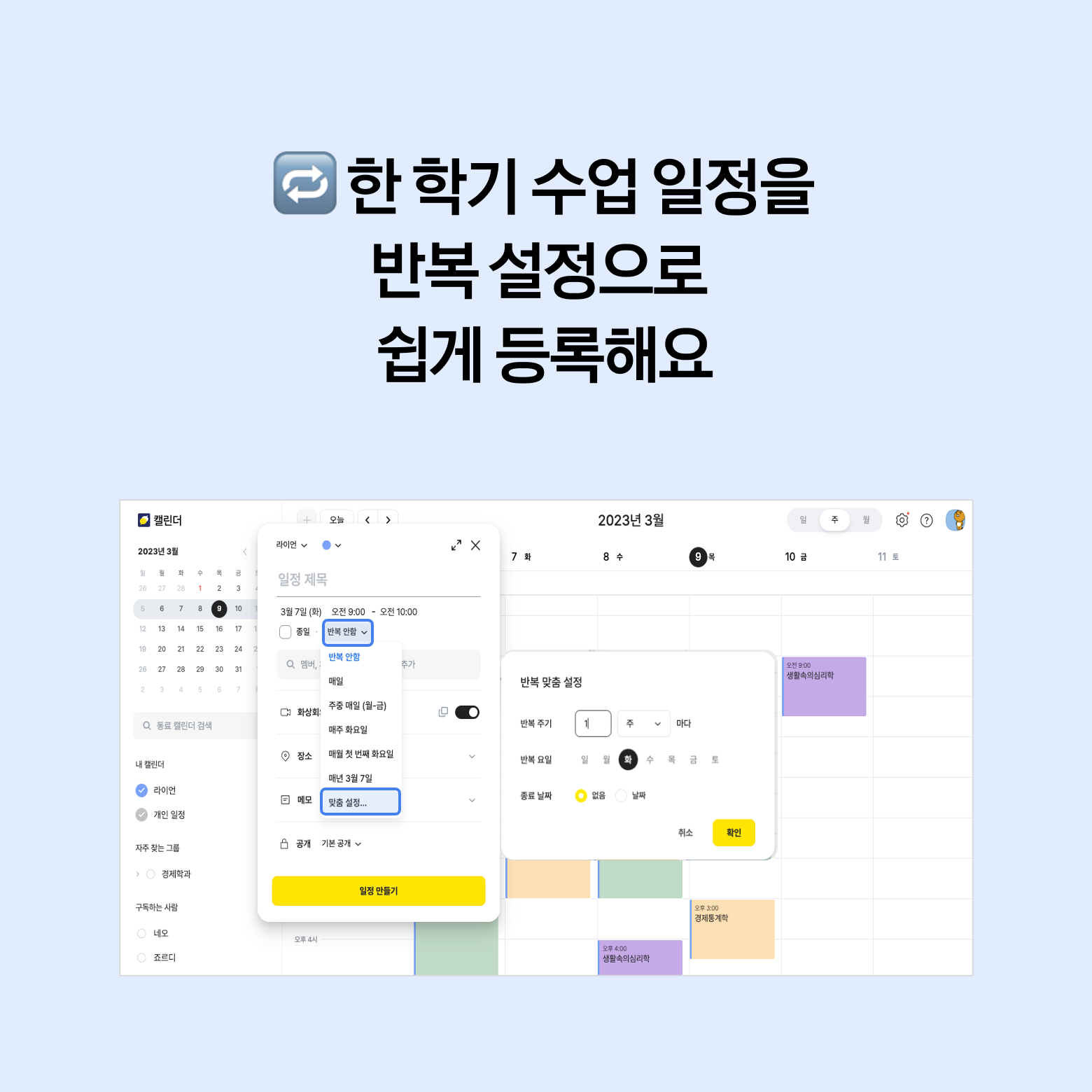 한 주의 수업 일정만 등록한 후, 반복 맞춤 설정을 활용하면 끝! 🔁