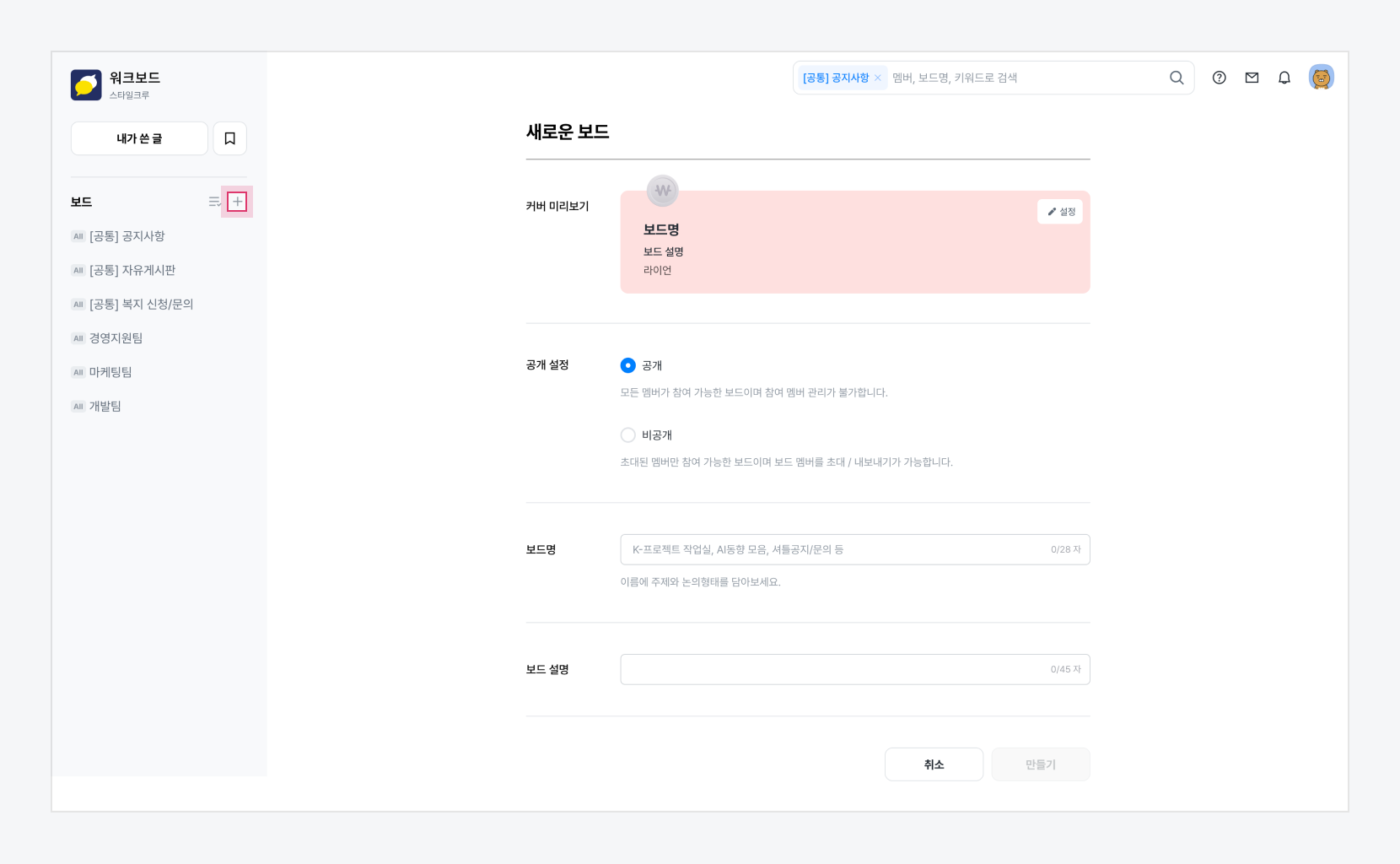 2.보드명, 보드 설명을 입력하고 공개 여부 및 보드의 대표 커버 색상과 이모지를 설정해요.