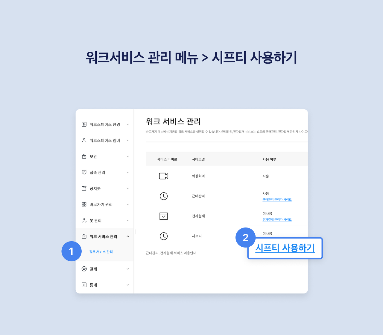 ✔️ 워크 서비스 관리 메뉴는 슈퍼 관리자 및 워크 서비스 관리 접근 권한이 있는 관리자만 접근할 수 있습니다.