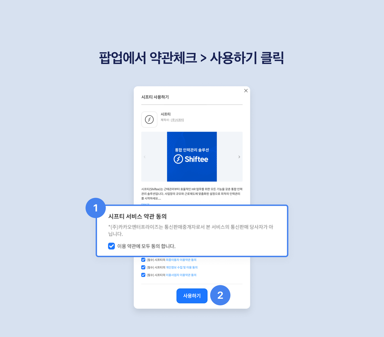 시프티를 사용하기 위해서는 카카오워크 관리자 페이지에서 '시프티 사용하기' > '약관동의' 가 필요해요.