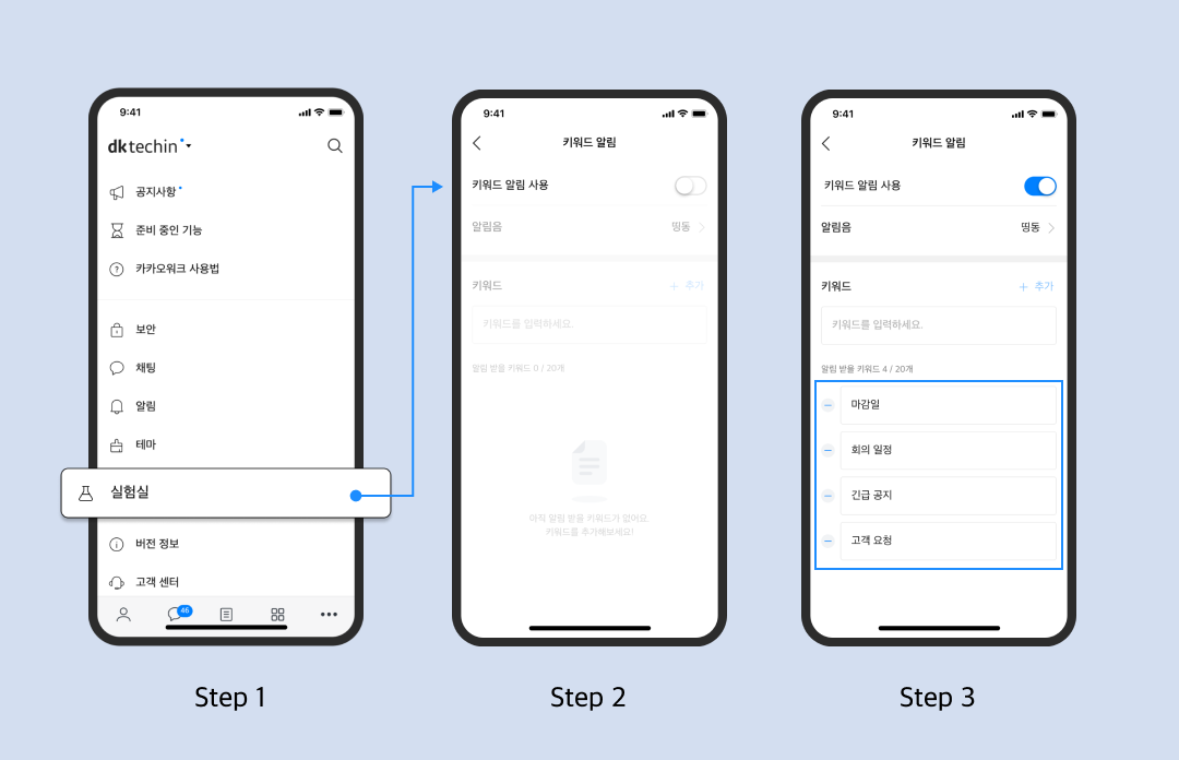 카카오워크 실험실에서 키워드 알림 기능을 사용해보세요.