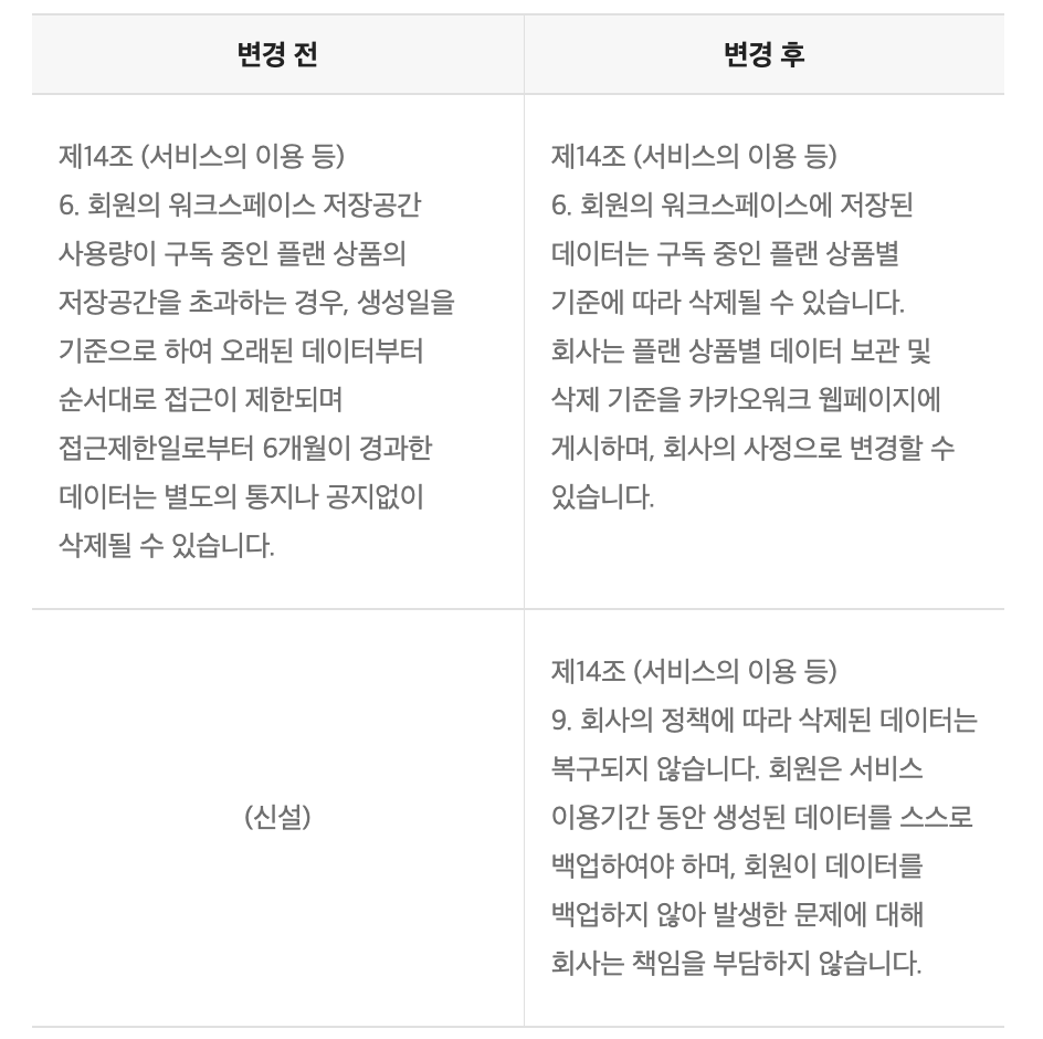 아래와 같이 카카오워크 서비스 이용약관이 개정될 예정임을 안내드립니다.