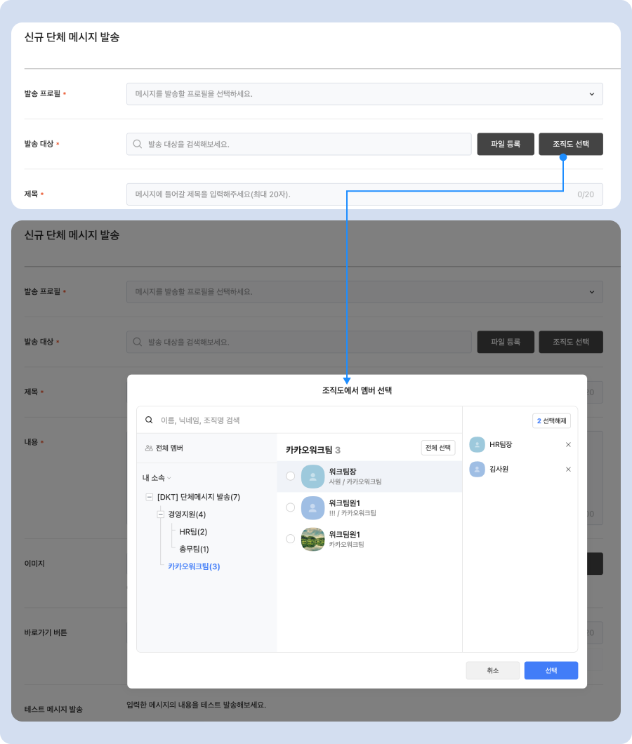 "단체 메시지 대상 선택, 조직도 기반으로 간편하게!”