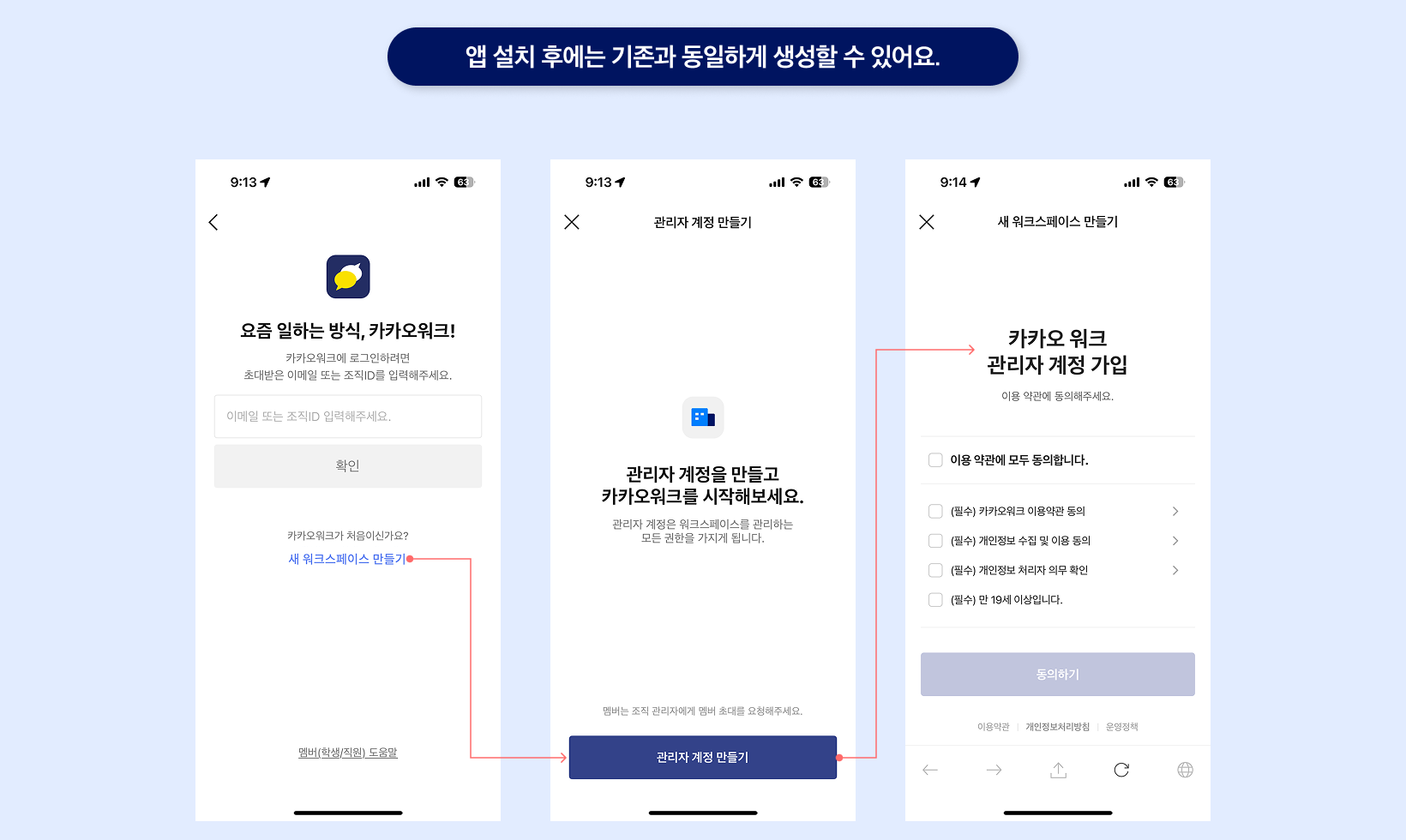 • 카카오워크 앱 설치 → 실행 → 로그인 화면 하단의 ‘새 워크스페이스 만들기’