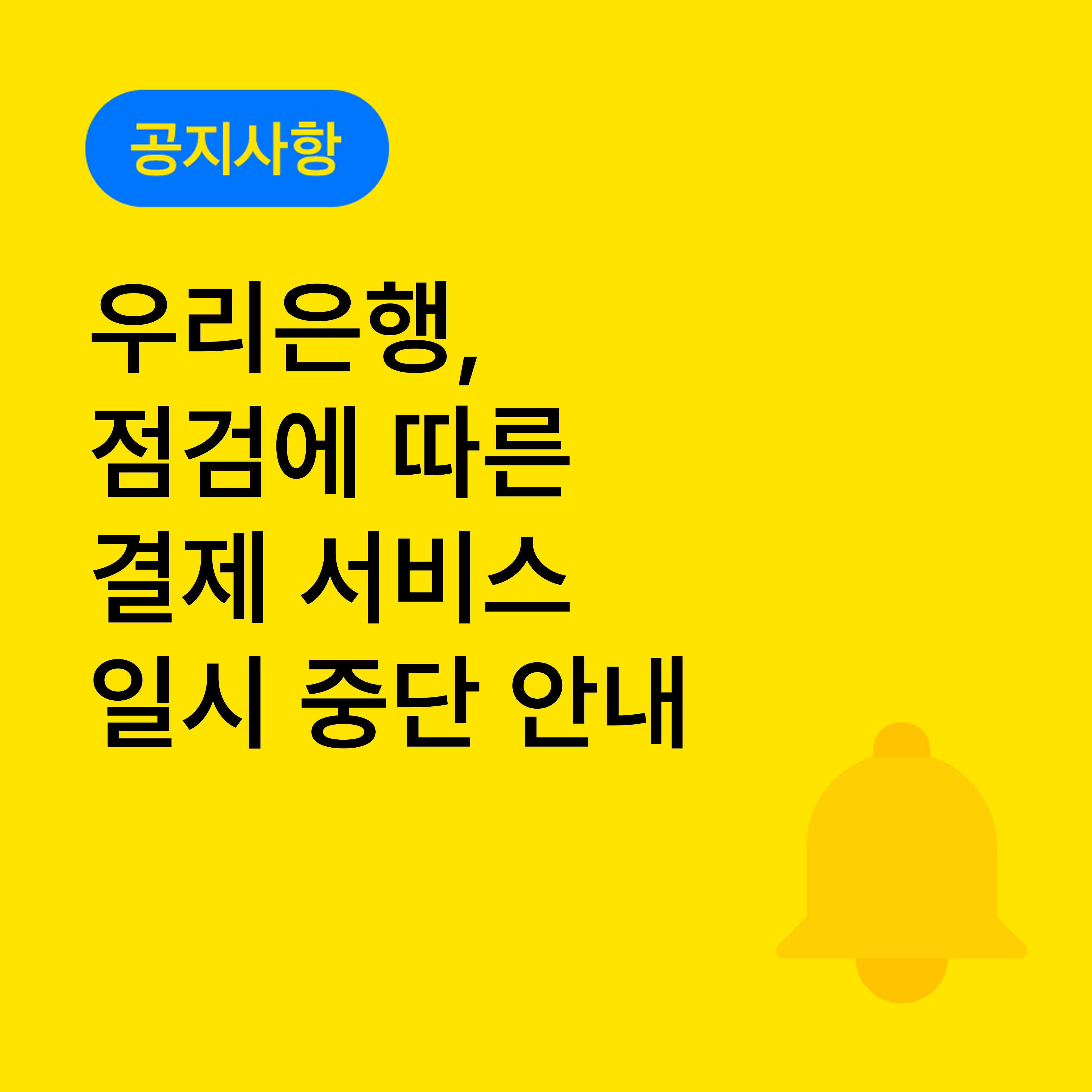 우리은행 시스템 점검 작업으로 인해 해당 기간 내 일부 결제 서비스 이용이 제한됩니다.
