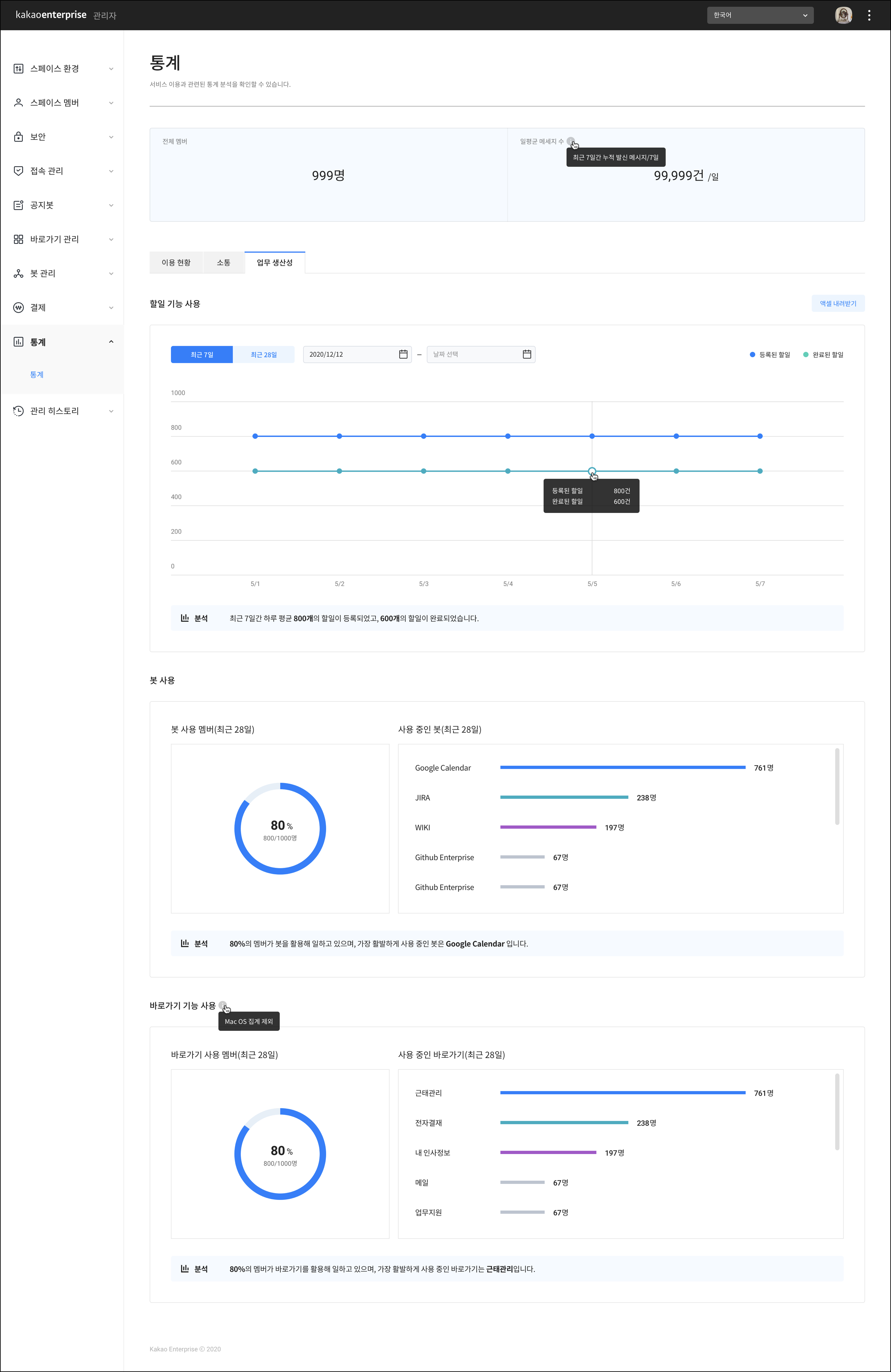 할 일 기능, 봇 사용, 바로가기 기능 사용 현황 확인
