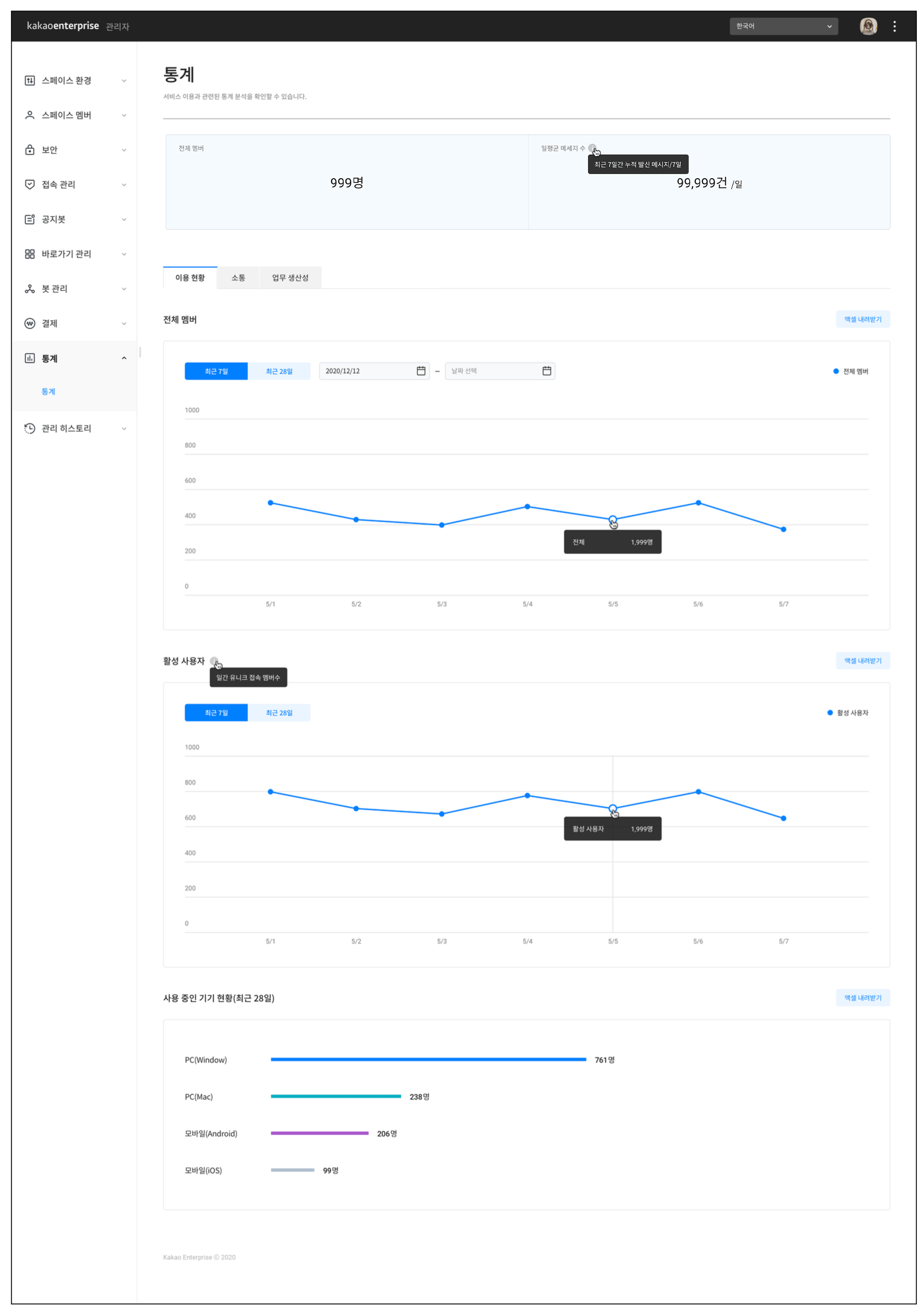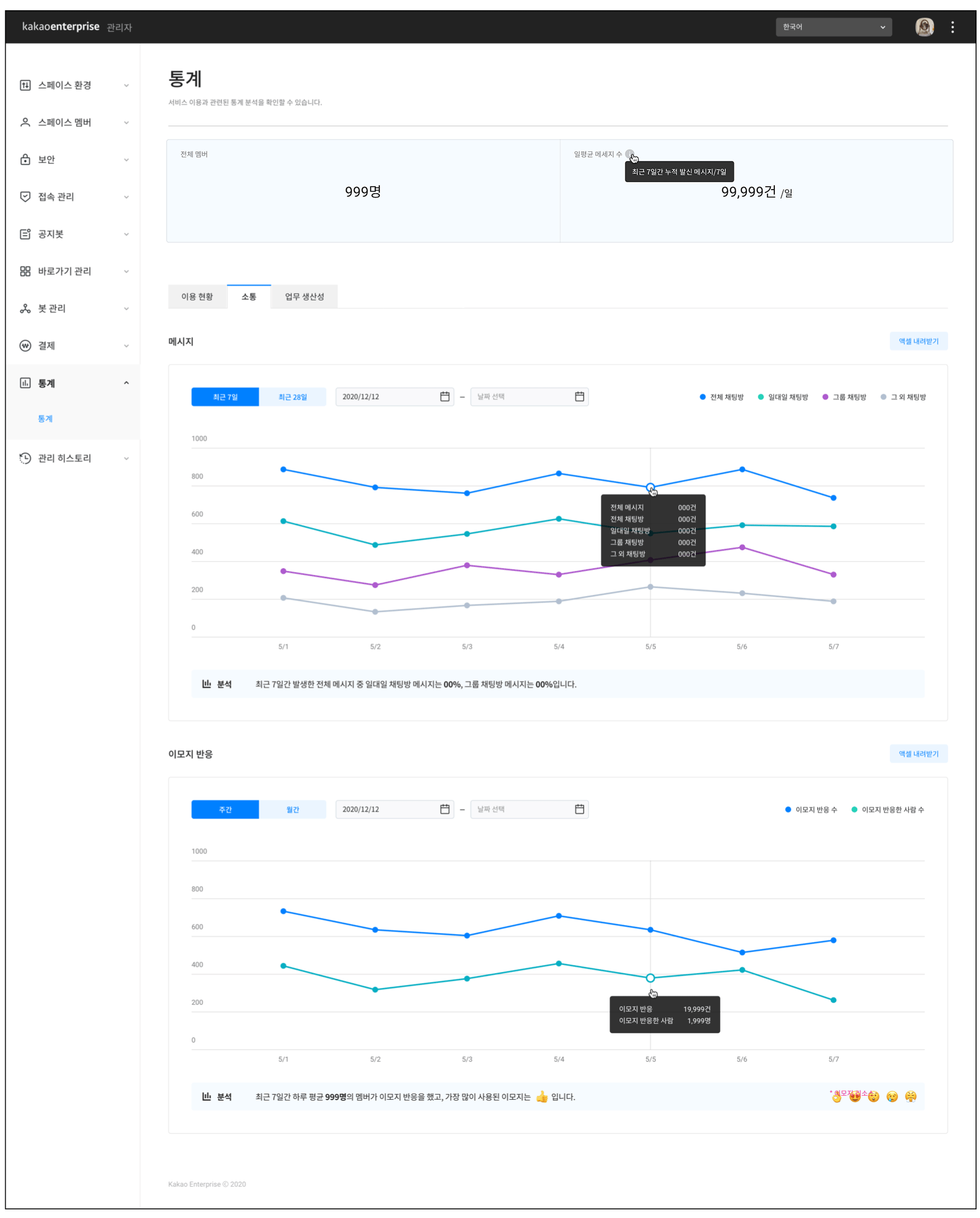 통계 데이터를 엑셀로 내려받을 수 있습니다. [이용현황]탭에선 전체 멤버, 활성 사용자, [소통]탭에선 메시지, 이모지 반응, 그리고 [업무 생산성]탭에선 할일 기능 사용 데이터에 대한 부분을 편리하게 내려받으세요.