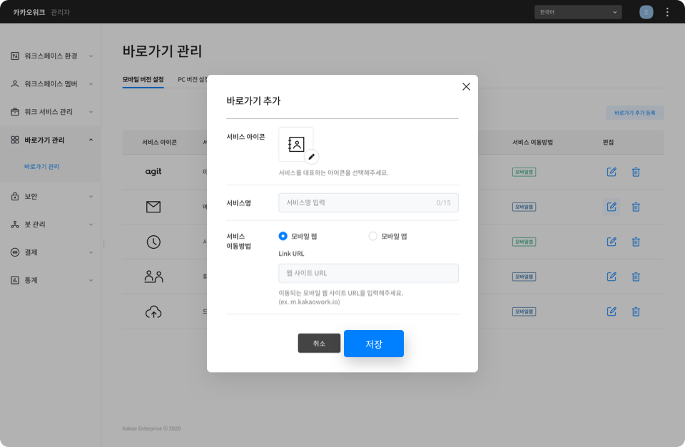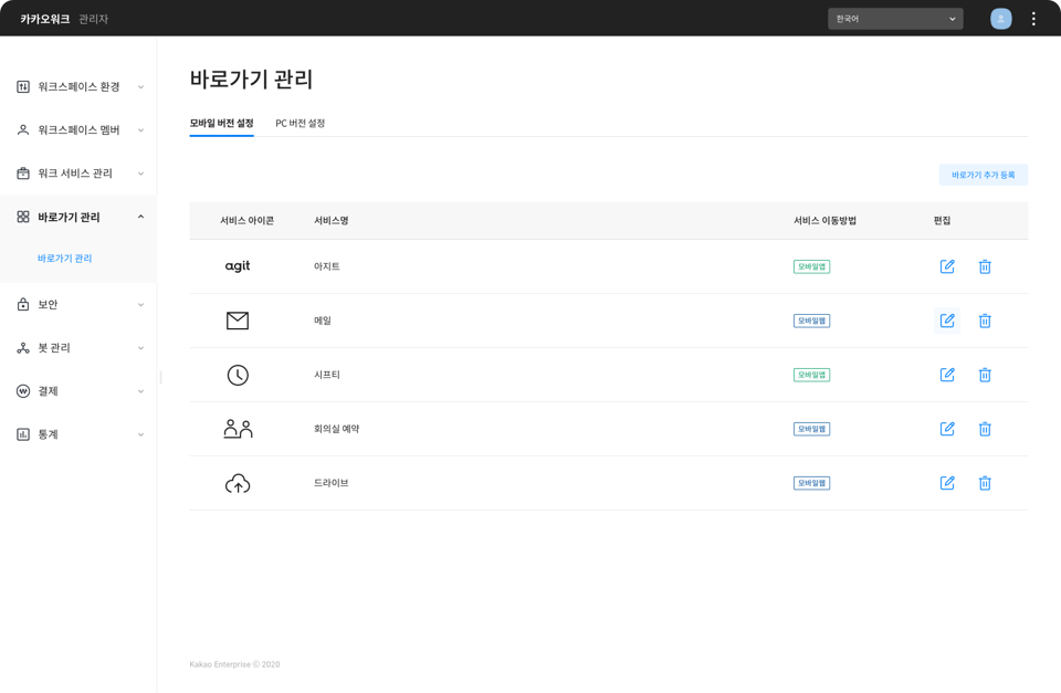 바로가기 관리에서 사내 서비스나 외부 협업 서비스 링크를 바로가기 영역에 반영해서 필요할 때 바로 이용해보세요.