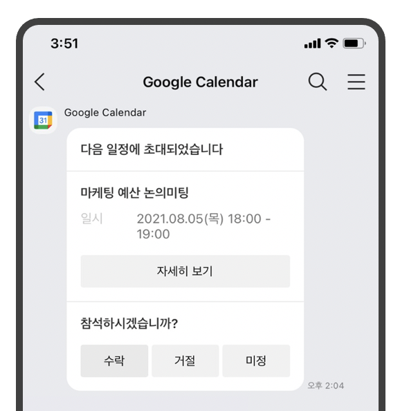 연동은 물론, 카카오워크의 구글 캘린더 봇을 통해