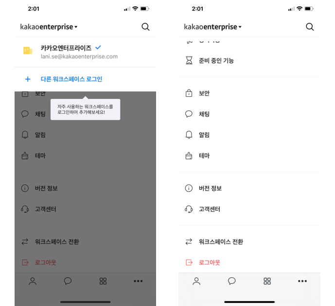 A. 현재 iOS에서의 워크스페이스 전환은 👇 아래 이미지👇 에서와 같이 이용하실 수 있습니다.