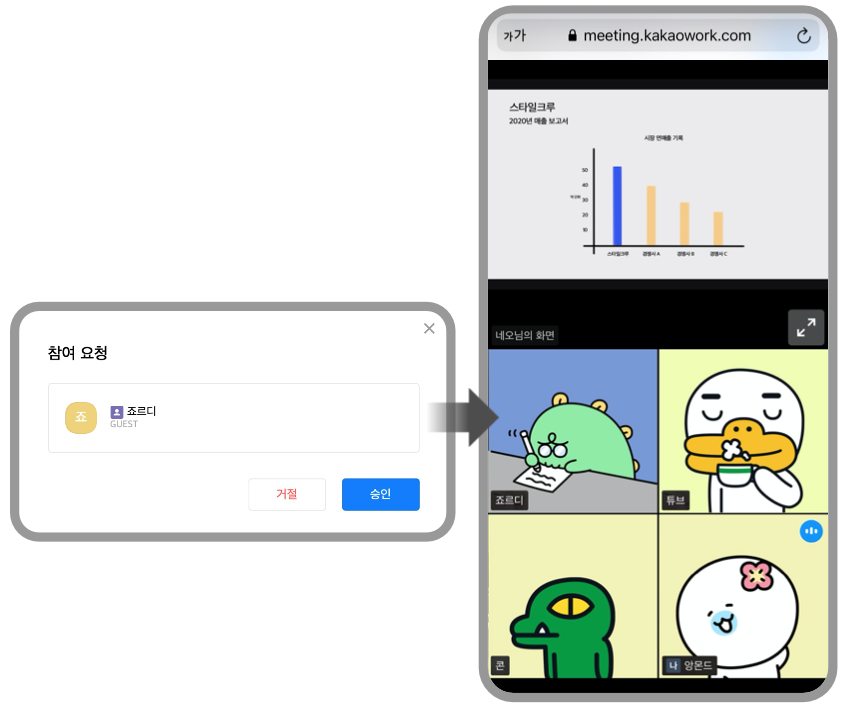 3. 초대링크만 있다면 카카오워크 [설치 없이 누구나 화상회의에 참석]할 수 있습니다