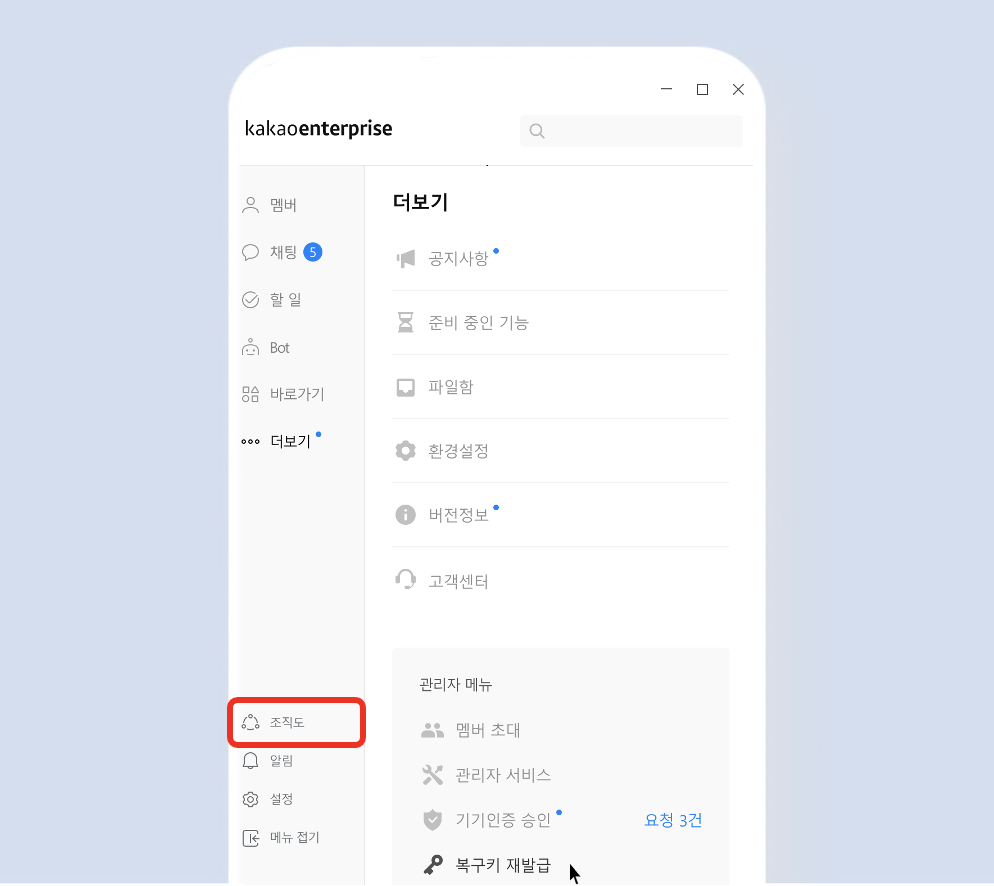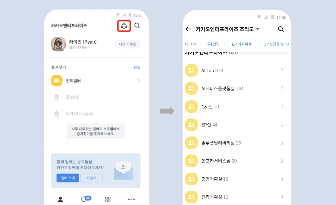 - 카카오워크 모바일 앱버전을 사용하신다면,오른쪽 상단에 [조직도] 아이콘을 클릭하시면 우리 회사의 조직도로 연결됩니다.