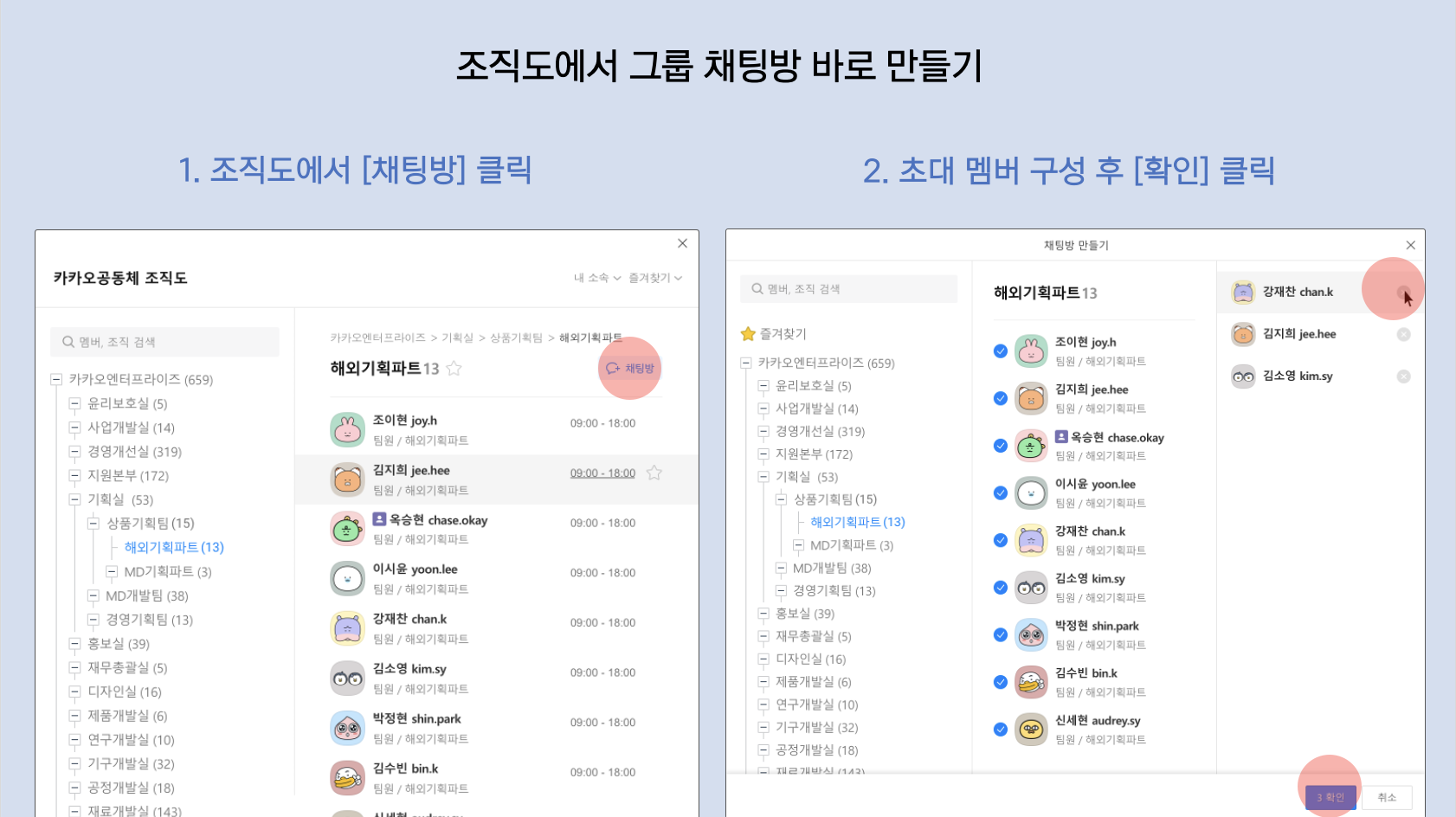 조직도에서 '채팅방' 버튼 하나만 클릭하면, 해당 멤버로 구성된 채팅방을 쉽게 만들 수 있습니다. 조직도를 참고하면 더 편하고 정확하게 필요한 멤버를 초대할 수 있겠죠? 이제 다른팀 동명이인을 실수로 초대해서 당황할 일은 없겠네요😳