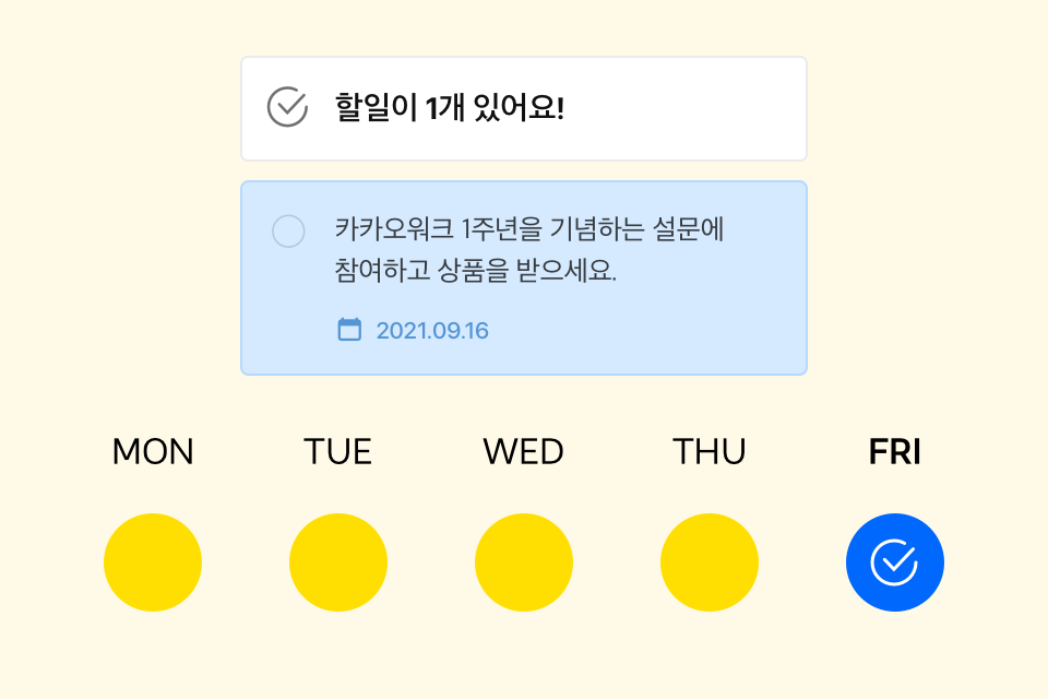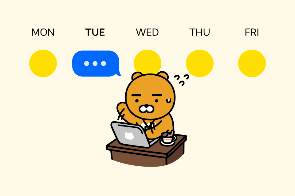일주일 모든 요일에 언제나 바쁘게 다양한 대화를 나누고 계실 카카오워크 사용자 여러분이 아무런 불편 없이 효과적으로 소통할 수 있도록 카카오워크팀이 월화수목금 모두 열심히 달리겠습니다 🏃🏻♀️🏃🏻♀️🏃🏻♀️